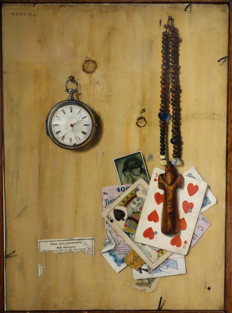 Yet, as one looks more closely at the painting, the easy certainty of this dichotomy starts to dissolve in a manner familiar to the trompe-l’oeil genre.6 The three glass beads of the rosary echo the cracked glass of the clock, connecting the two objects visually and blurring the lines between the supposedly opposed ideas that they symbolize. The complex nature of the relationship between the two elements is further highlighted by a newspaper fragment painted just below the watch, on nearly the same height as the cross. The clipping bears the painting’s title, but in place of the expected artist’s signature, we find another name—“Bob Ingersoll.” Haberle appears to be referring to Col. Robert Ingersoll (1833–1899), an infamous orator who captured the public imagination with his controversial lectures on agnosticism and free thought. In fact, the newspaper clipping in the painting also reads, “In the county jail . . . awaiting trial,” evoking two instances, in 1880 and 1895, when Ingersoll was tried and acquitted for blasphemy.7 Haberle’s contemporaries would have been familiar with Ingersoll’s viewpoints, and they would have been well aware of the fact that Ingersoll did not believe in eternity. Haberle, who throughout his career defied the censorship of currency reproduction and obscene imagery,8 is very likely aligning himself with the freethinker, acknowledging him as the authoritative source of the artwork (the rendition of the orator’s printed name thus appears as a double for the artist’s signature, illusionistically carved at the top-left corner of the canvas). Between the cracked watch face and the undermined notion of religious eternity, what Haberle offers here is a vision of temporality dominated by ambiguity and doubt rather than by certitude.