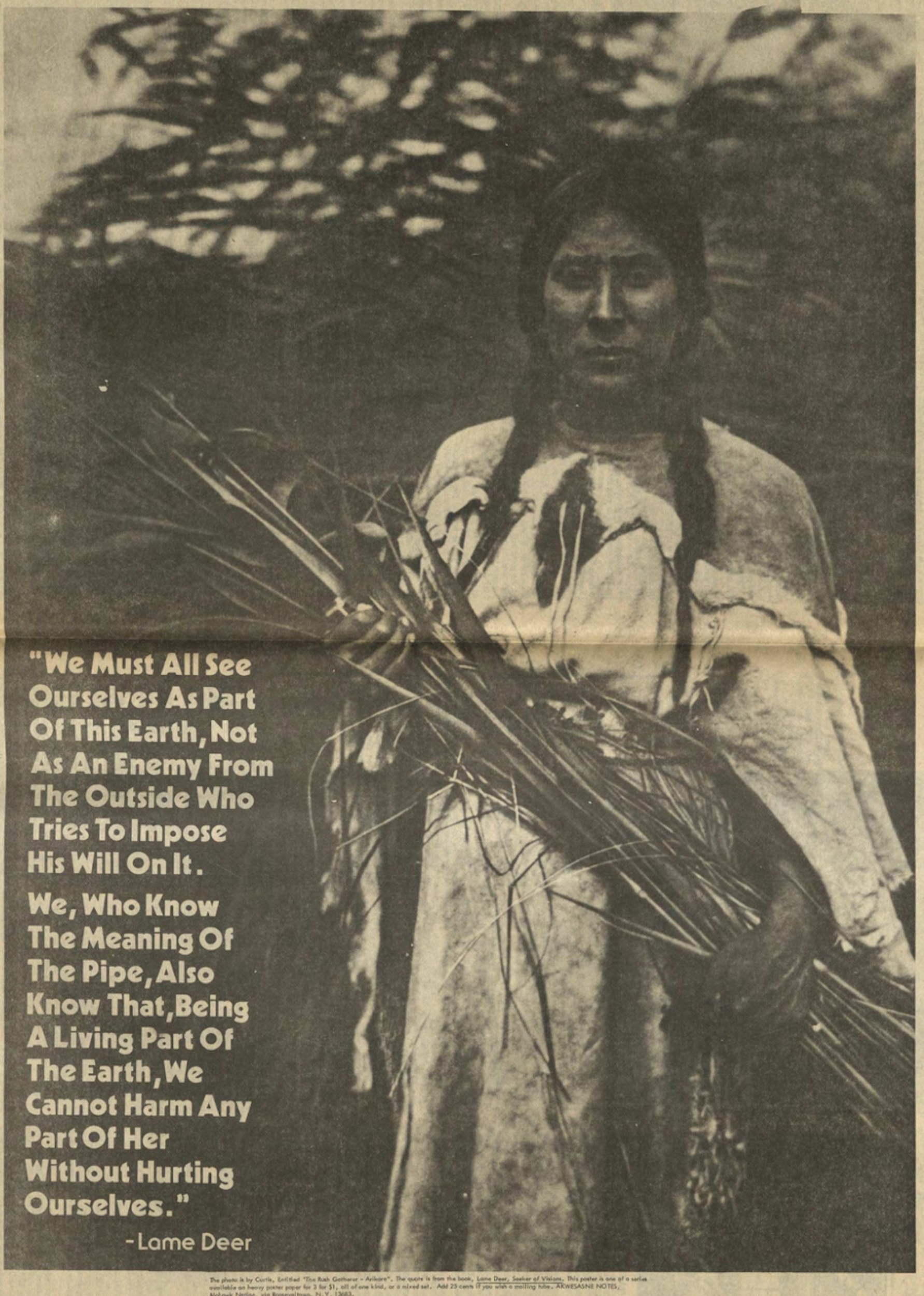 Notes’ communal design and editing process and shared creation of imagery breaks from colonialism’s aspiration to isolate Native individuals from their pasts, futures, and one another—something nineteenth- and early twentieth-century portraits of Indigenous peoples by white settlers did visually. The recontextualized portraits in the Notes collage poster series not only transformed their white makers’ original intent into a more holistic, Indigenous, community-grounded mode of representation, but they also expanded these objects’ relationship to land/place, identity, and time. For instance, Edward Curtis’s 1908 photogravure titled The Rush Gatherer—Arikara depicts an Arikara woman clad in a hide dress, standing by herself against a backdrop of tall rushes (fig. 5). Her hands are wrapped around a bushel likely chosen for mat-making purposes. Like many turn-of-the-century portraits of Native women by white men, she is shown isolated in nature and appears historically bound. By placing her in proximity to a superimposed quote from Sioux medicine man Lame Deer, however, she is transformed: “We Must All See Ourselves As Part Of This Earth, Not As An Enemy From The Outside Who Tries To Impose His Will On It . . .” (fig. 6). This simple restructuring restores her power and agency and points to her as custodian of the land in which she is posing. The quote’s emphasis on the word “we” also underlines the poster’s collectivizing intent, which supported contemporary activists’ ongoing efforts to create pan-Indigenous solidarity throughout the 1970s. In visualizing and inspiring relationality between all Native people, past and present, the creators of Notes diverted the liberating notion of possibility, or “the otherwise,” into Native hands and prevented coloniality’s dissolution of Indigenous futures.