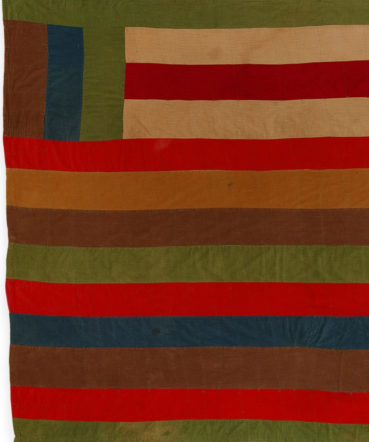 The palette of Pettway’s quilt—avocado green, coral red, denim blue, and various shades of brown and tan corduroy—is thus a reimagining of a more colorful union that is itself grounded in shades determined by consumer preferences for 1970s-era interior design. Corduroy’s pinwale structure makes it a difficult fabric to cut and piece at angles, perhaps one reason for Pettway’s decision to go “Lazy Gal,” a nickname that Benders gave to quilts in which uninterrupted vertical or horizontal strips dominate, as opposed to the many small pieces of fabric improvised into the complex designs for which this community is most celebrated. Piecing or appliquéing stars in corduroy would have been difficult and time consuming, and yet Pettway was so effective in reimagining the basic bones of the flag that her quilt has achieved a kind of iconic status, appearing not only on the Bee’s homepage but also as the cover image for Jill Lepore’s 2020 book, This America: The Case for the Nation. But before it was a work of art preserved in a museum—before it was made available for image licensing—Pettway’s quilt was a blanket, one that allowed her family members to nestle themselves in the heavy warmth of a colorful corduroy flag, experiencing a buffer from the cold; perhaps the quilt was also a personal affirmation that the flag could be a source of pride and protection.