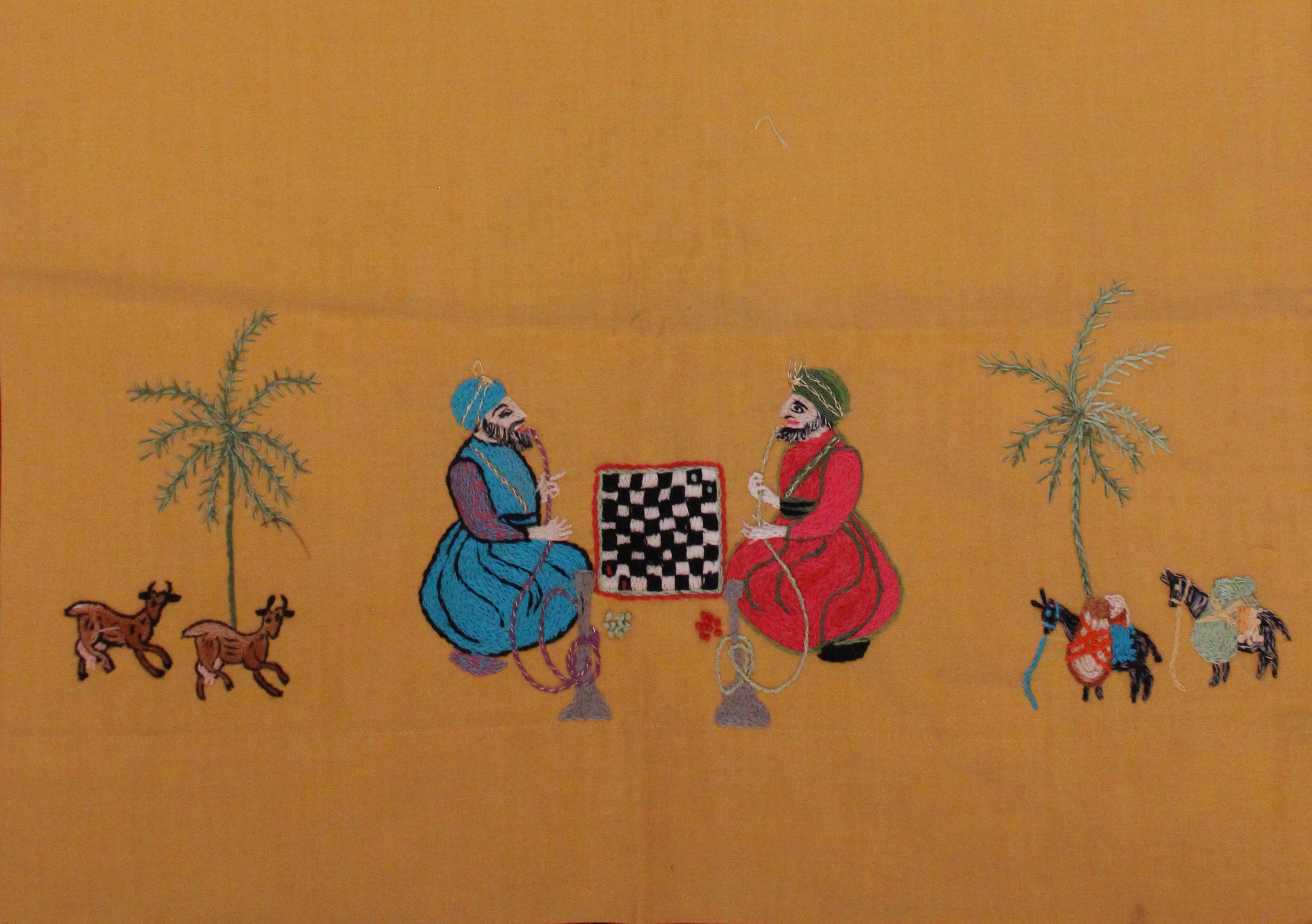 Two gold pillowcases accompany the flat sheet. The first depicts a supine woman wearing aqua blue pants, languishing on a chaise, holding her pipe. Another woman, dressed in a pink dress with a lilac veil and distinguished by her rose-red nails and lipstick, stands over her (fig. 2). Each stitch, comprised of thick thread, forms a lined portrait akin to etching. The second pillowcase depicts two men seated by a gameboard, enjoying their pipes while surrounded by date trees (fig. 3). Two small brown cows and two saddled horses overlap with the foliage, suggesting they are tied to the trees. The green and red dots below the board are colored game pieces. Individual stitches are visible yet continuous, making the folds of the clothing echo the fabric. The two women and date trees are repeated, unifying motifs throughout the scenes.