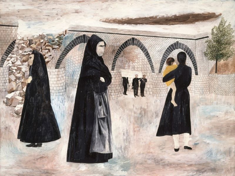 A generous section of color plates follows the essays and is organized according to the thematic sections of the exhibition. Each group of plates is preceded by a short text by Katzman that introduces the central concept that unites the selected works and situates them within Shahn’s larger career. An excellent feature of the plates section is that it includes many of the photographs to which Shahn turned in producing his paintings, drawings, and prints. For numerous works, Shahn relied on his own photographs as inspiration. For example, the gouache-on-board painting Handball (1939) appears alongside two photographs Shahn took of Houston Street Playground in the early 1930s. Through this side-by-side comparison, readers can see how Shahn adapted elements of each photograph for his painted composition. Shahn also maintained a robust collection of press photographs that he consulted when developing new work. One of the clippings featured in the catalogue is a news photograph taken during the Spanish Civil War that shows a group of women and children huddling in a cave to protect themselves from nearby bombardments. The central figure from this clipping, a sturdy matriarch clad in black, appears in Shahn’s 1943–44 painting Italian Landscape. The dramatic shift in context between press photograph and painting was not unusual for Shahn, as Katzman argues in the exhibition and elsewhere, and suggests the tensions in his use of “real-world particularities” to craft “universal symbols for his time” (33).5