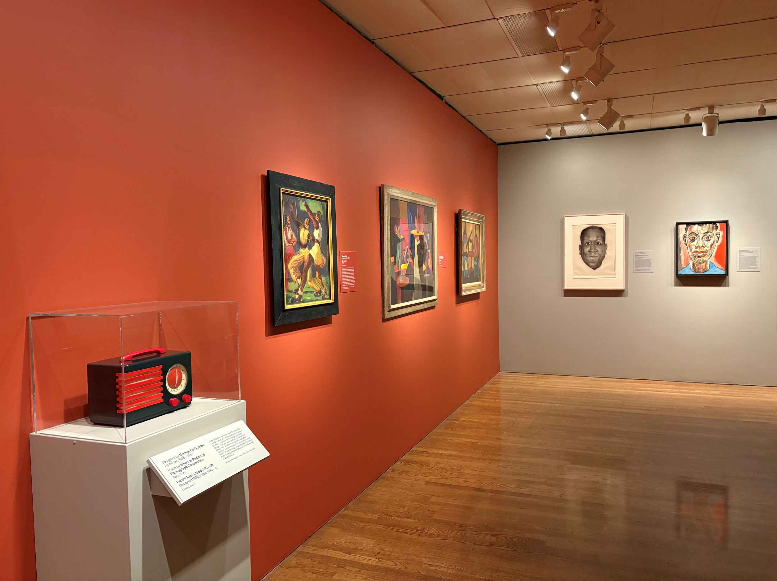 Interior of a museum gallery, showing a corner where two walls, orange and gray, meet. Two framed works of art hang on the gray wall; three works hang on the orange wall. Also against the orange wall is a black-and-red radio sitting on a pedestal and encased in glass.