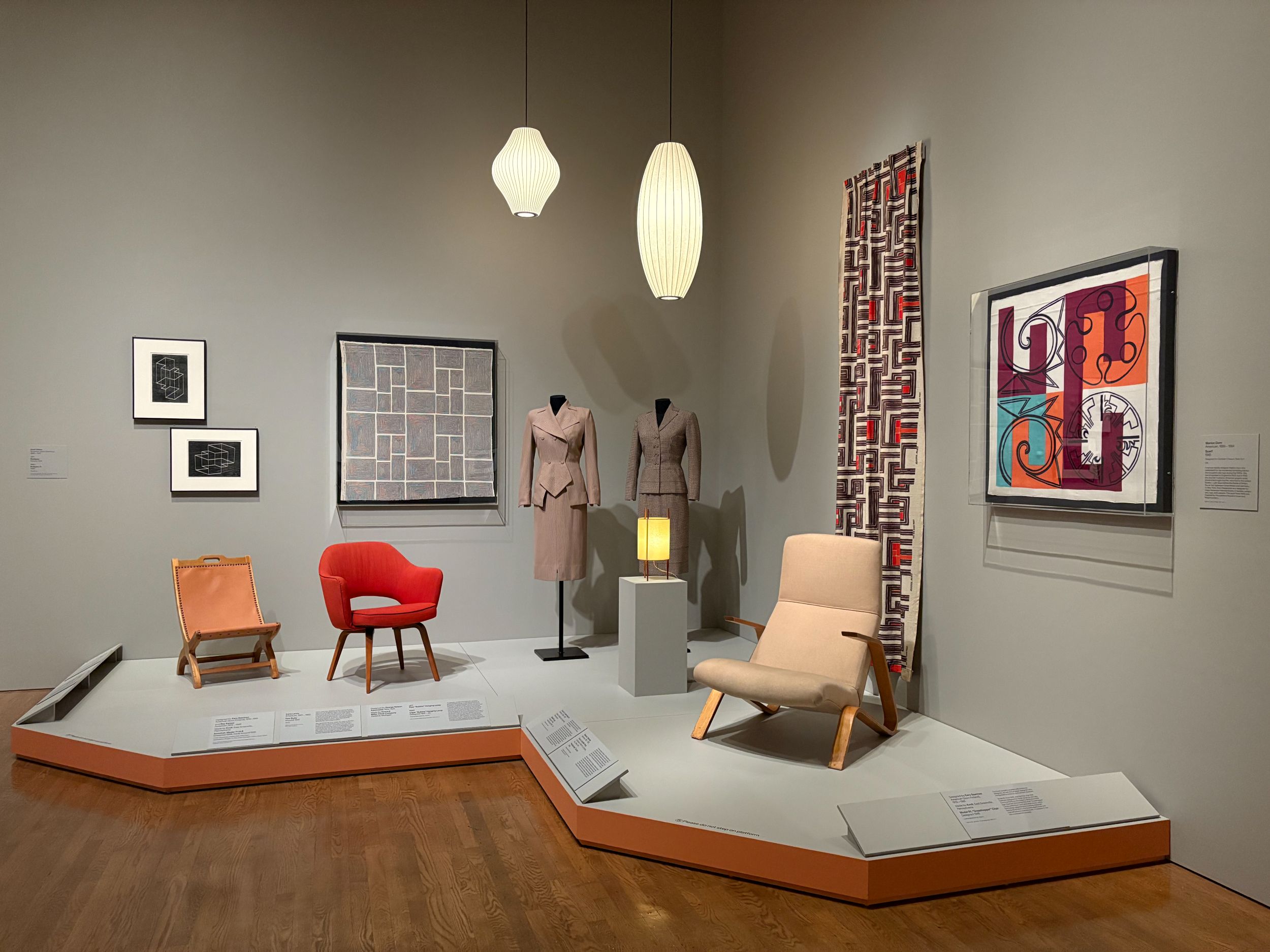 Fig. 2. Installation view of prints by Josef Albers, suits by Irene Lentz, and Bubble hanging lamps by George Nelson Associates of New York, from Boom: Art and Design in the 1940s, Philadelphia Art Museum, April 12–September 1, 2025. Photo by the author