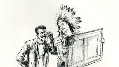 Castaigne’s depiction participates in a larger cultural practice of treating the American Indian as a metonym for non-Native American culture in France. In a period during which American artists were told by critics like Henry Tuckerman (1813–1871) that American Indian iconography could offer a unique contribution to the art world, Castaigne’s choice is unsurprising. “Tales of frontier and Indian life… awaken instant attention in Europe,” wrote Tuckerman in 1867. “If our artists or authors,” he persevered, “wish to earn trophies abroad, let them seize upon themes essentially American.”27 By the late nineteenth century, American artists in Paris had taken up that challenge, submitting many objects depicting western subjects to the Paris Salons and Universal Expositions.28 There is a likely dialogue between Castaigne’s illustration and the American imagery that allegorized the American Indian as an idealized icon for American art, such as Czech artist Luděk Marold’s (1865-1898) illustration “Art Presented to America” (fig. 4). This image topped the heading of a chapter on the art of the United States in an 1893 book, Art and Architecture: World’s Columbian Exposition by William Walton, a volume for which Castaigne also submitted illustrations. Marold’s illustration opposes an American Indian wearing a feathered war bonnet and buckskin clothing sitting on a throne at the left and the artistic muses who stand on sketches at the right. A large eagle bursts through the picture frame at the left of the scene, its wing tips extending beyond the edge of the image. In its placement at the start of an essay on the progress of art in the United States, the image literalizes Tuckerman’s dictum; the nude female figure at right raises her palette high in the air and regards the stoic American Indian and dynamic eagle with intrigue as a new artistic subject. Castaigne’s depiction of Phil’s haughty face in the parade echoes this figure (fig. 1), but instead of using the American Indian as a subject in art, Castaigne takes his character further to actually perform as an American Indian. It marks a distortion of Tuckerman’s and Marold’s suggestions; here, the icon of the American Indian becomes exaggerated to the persona of “playing Indian.”
