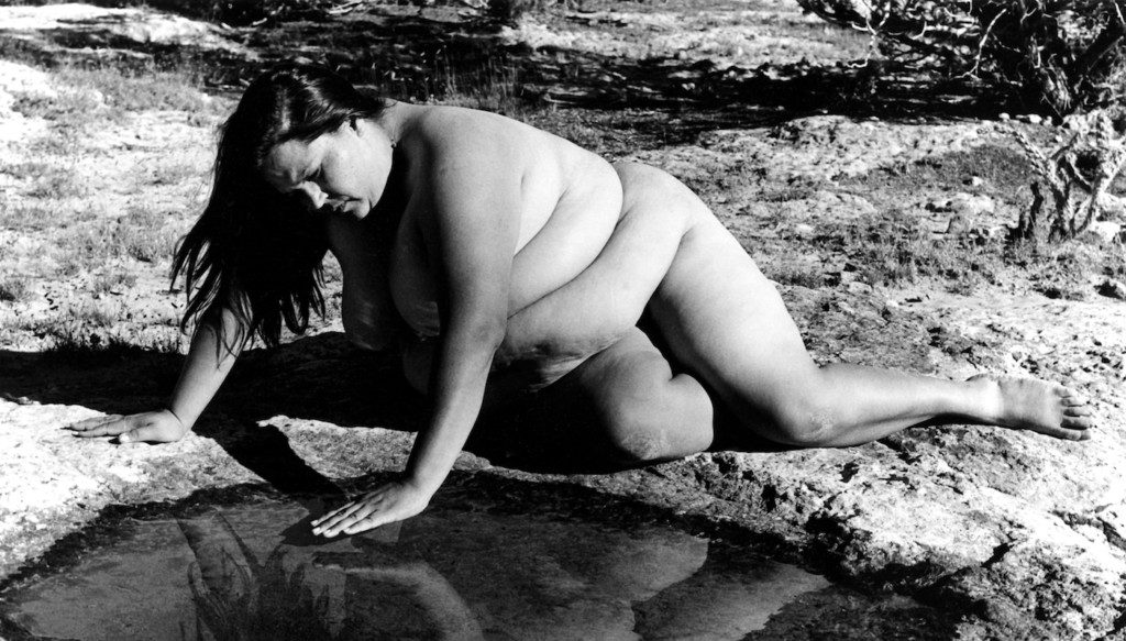 The exhibition continued on the third floor of VPAM, with Aguilar’s more recent work. Her most famous nude self-portraits are here, the ones that feature her and her collaborators in landscape settings, such as Nature Self-Portrait (1996), Motion (1999), and Grounded (2006–7). The power of these images is based in their manipulation of conventions governing the depiction of the reclining nude female body in nature, a subject that dates back to the Venetian Renaissance, when it was formulated by artists Giorgione and Titian. The distinguished Renaissance art historian Rona Goffen argued that these images originally encoded explicit sexual content, because the outdoors was associated with lovemaking at the time, but awareness of this meaning has dimmed over the centuries.6 Goffen’s reading of the reclining female nude in the landscape is central for understanding Aguilar’s radical portrayals. While there has been some commentary on Aguilar’s obesity, one critic describing it as an example of her “radical vulnerability,”7 insufficient attention has been paid to the erotic potential of her nude female subjects. While teaching about Aguilar’s photographs in a seminar in Chicana/o Studies at UCLA in the spring of 2017, I was struck by graduate student Dafne Luna’s powerful and discerning comment on Nature Self-Portrait #4 (1996) by Aguilar. While I discussed the history of the reclining pose, students were quick to point out the monumentality of Aguilar’s body, which resembled a natural feature of the landscape. Luna redirected our conversation: “How powerful it is to see a body like hers eroticized,” she interjected, “particularly for people whom society tells they don’t deserve love because of their weight, sexual orientation, or skin color.” In other words, Aguilar brought to visibility the erotic life of people who are fat, queer, and brown.