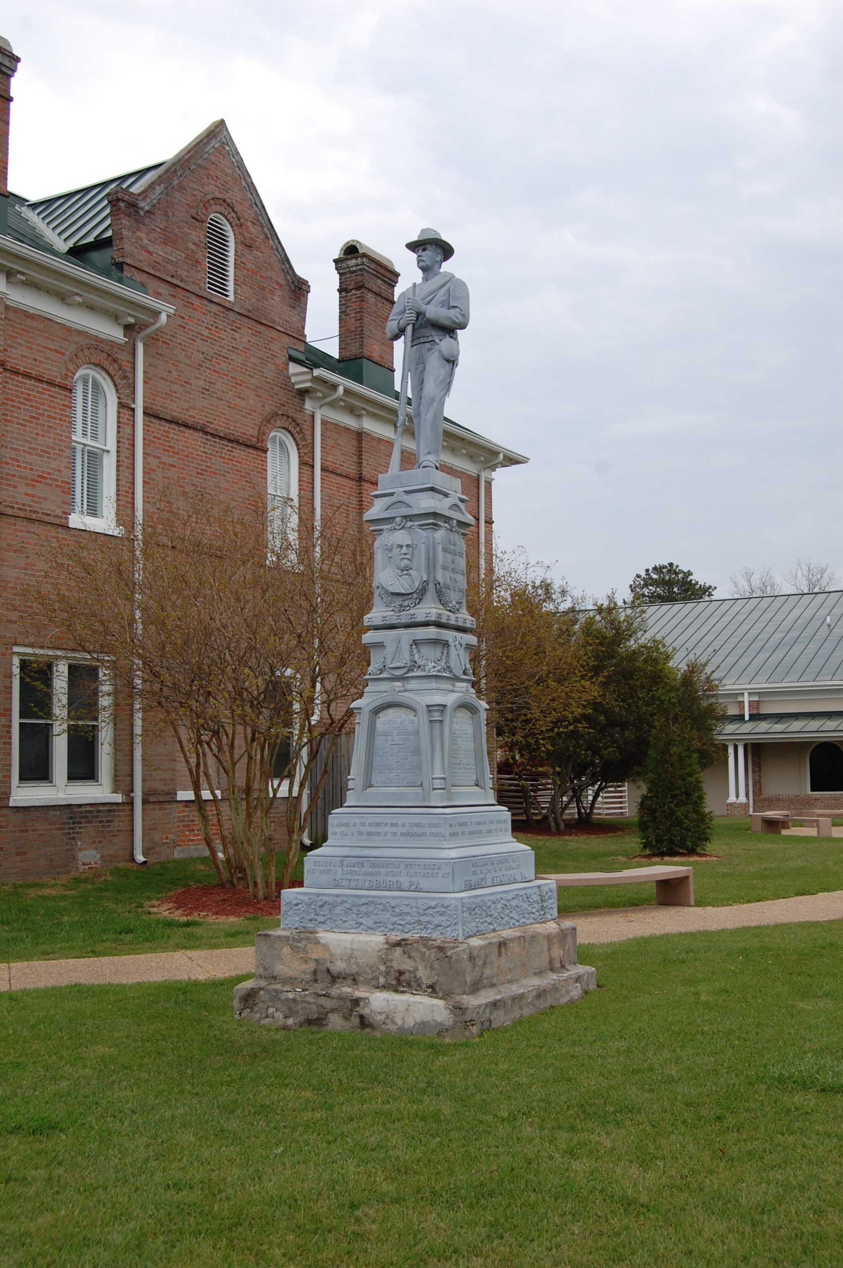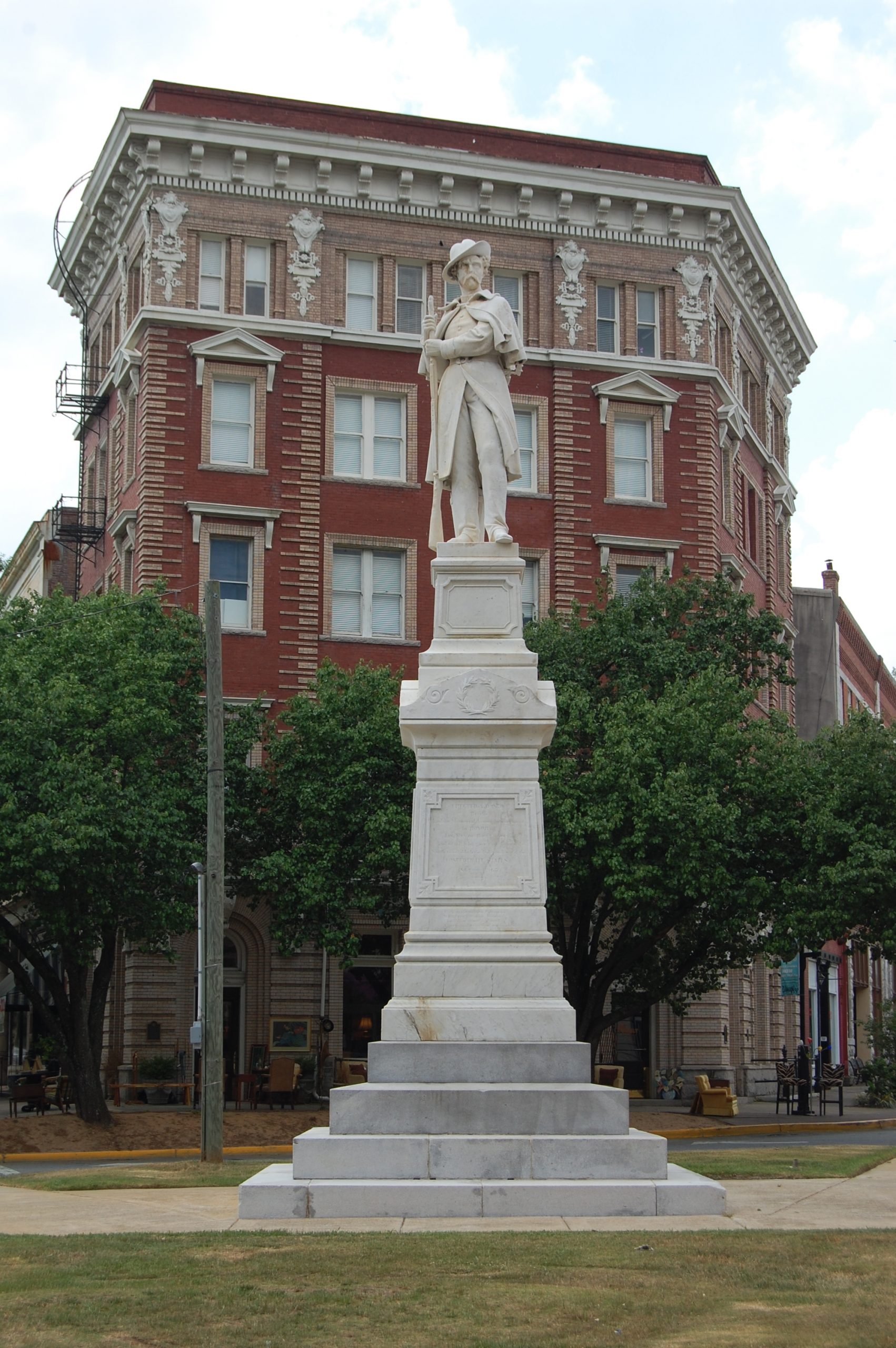Most Confederate monuments were not manufactured by Southern artists. Due to the lack of an established public sculpture tradition or the necessary industrial infrastructure to produce fine art statuary, Southern monument committees had to look outside the region for sources of sculpture. Many soldier statues were manufactured by Italian carvers who churned out Confederate statues in white marble. Others were the products of large Northern firms, such as the Monumental Bronze Company of Bridgeport, Connecticut, that sold their replicated soldiers in trade catalogues. In many cases, statues sourced outside the region were placed on bases carved out of local stone and marketed by local firms: the Muldoon Monument Company of Lexington, Kentucky, and the McNeel Marble Works of Marietta, Georgia, were both successful with this model (fig. 1). In iconography, Confederate statues also borrowed from their Northern counterparts: like Union monuments, most Confederate statues feature soldiers standing at some form of parade rest. And in costume, they tended either to be indistinguishable from their Union counterparts—wearing a long overcoat and a kepi—or conforming to the type popularized by the Monumental Bronze Company, with a short shell jacket and slouch hat (fig. 2). In form and manufacture, these statues reflect both the national and international nature of the postbellum memorial landscape.2