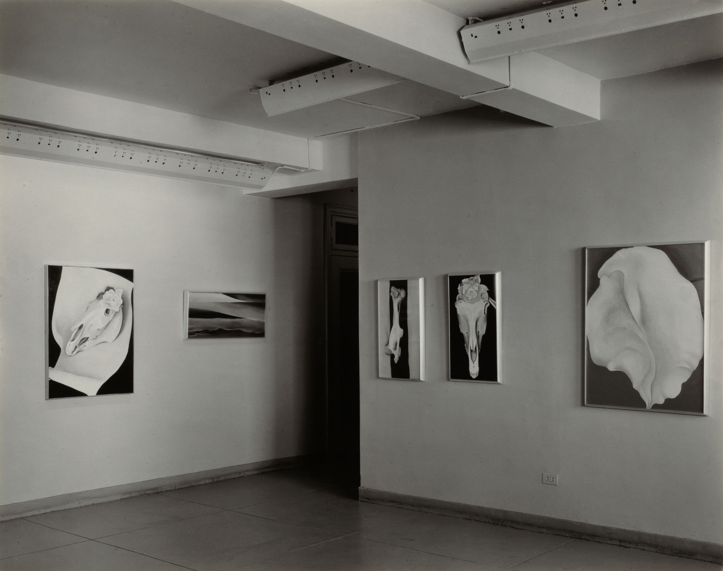 Stieglitz framed the image at the left edge of an installation shot he snapped during the exhibition (fig. 2), flattening the vibrant tones of the canvas into gradations of black and white. In the photograph, the painting hangs on a stark gallery wall that blends at the edges and corners of the room into the pale gray of the stone floors and the shadowed white of the ceiling.2 In the black-and-white photo, the animal bone at the center of O’Keeffe’s image hovers over a light background that pulls away from the edges and corners of the frame to reveal dark pools of paint; it appears, as one unnamed critic had written in response to the inaugural exhibition at Stieglitz’s space one year earlier, to be “suspended in air rather than backed against a wall.”3
