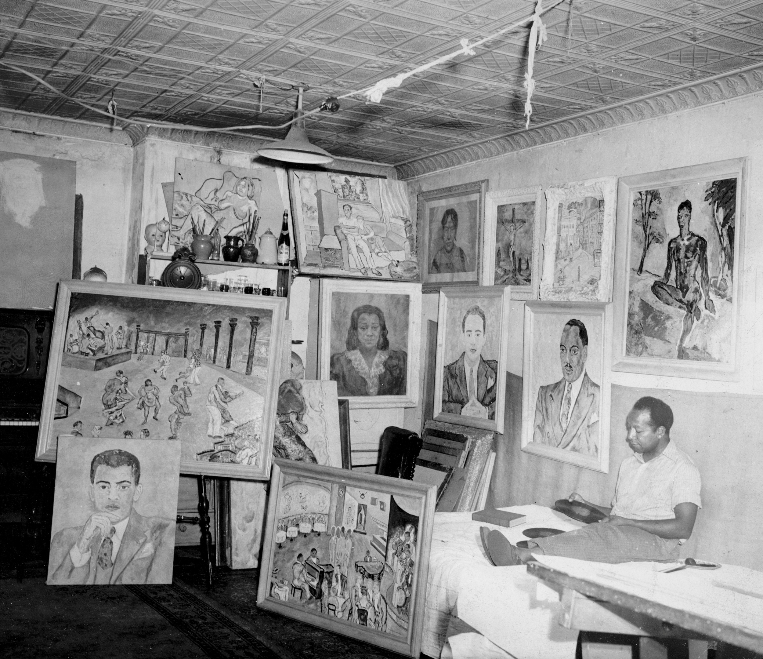 Black-and-white photograph of an artist's studio. In the lower right is a Black man seated on a couch or bed. More than a dozen paintings hang on the walls or are propped up on the floor.