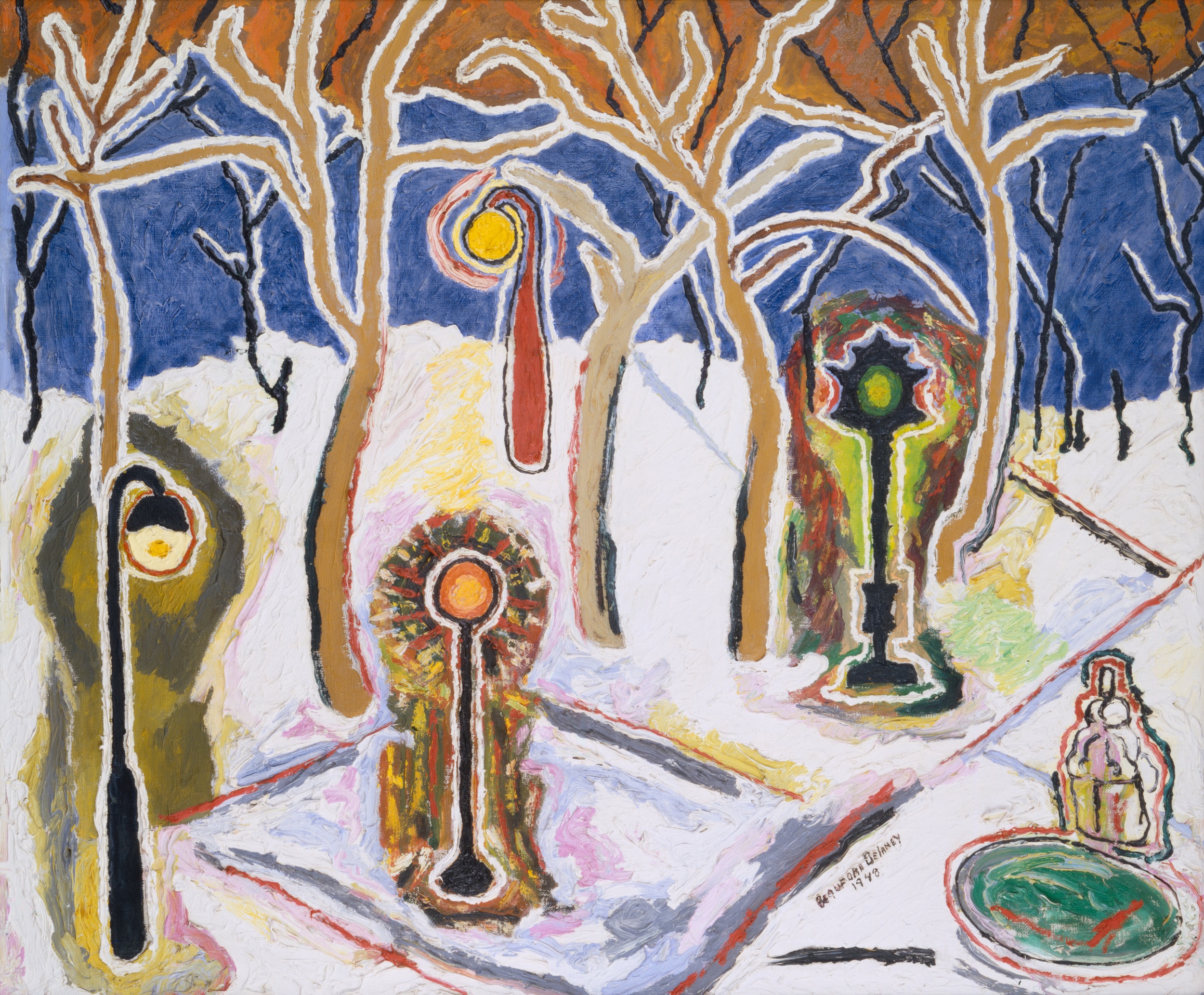 As O’Keeffe was reshaping the critical parameters of her work by displaying images of New Mexico—her place—at the gallery, Delaney was carving a space for himself within the Stieglitz circle through his own deep engagement with the discussions unfolding within those walls. Against the white sheets of paper in the ancillary exhibition space that he shaped in his small apartment, he displayed the paintings he made of the sprawling Greenwich Village streets outside his window—the narrow stretch of land that he knew most intimately. These images, as Miller recalls in his reflections on his visit to Delaney’s studio, were “virulent, explosive paintings devoid of human figures.” They were “Greene Street through and through, only invested with color,” he goes on to note, “full of remembrances too, and solitudes.”28 In the 1948 image Washington Square, for example, Delaney outlines a grove of skeletal trees in white outlines (fig. 6).29 Their ocher branches fade into black in the background, and the top edge of the painting is built up of layered patches of orange and brown paint that shift into a stretch of blue sky. A trunk at the left edge of the image intersects, along a curving white border, with a black lamppost that extends down vertically toward the bottom of the image. Its yellow bulb, bordered in concentric circles of orange and white, illuminates the white expanse of the foreground in textured planes of gold and green. At the center of the painting, and up toward the top, another electric light casts a yellow beam down the canvas. This lamp seems to dangle from the branches extending above, as if it is suspended over the tactile layers of white paint below, recalling both the bone that hovers over the undulating surface of O’Keeffe’s Horse’s Skull with Pink Rose (see fig. 1) and the way that images appeared to float off the white walls and into the light-filled rooms of An American Place.