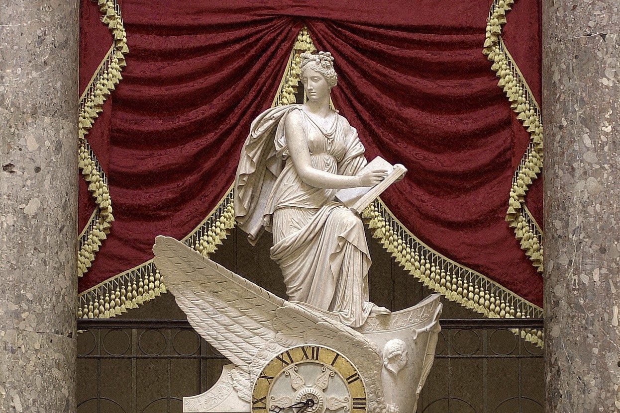 The breach of the Capitol on January 6, 2021, has not only reframed my view of this symbolic building’s relationship to the public, it has also prompted me to reengage with one of its oldest and most evocative works of art. The eloquent and functional Car of History (1819) by sculptor Carlo Franzoni (1789–1819) and clockmaker Simon Willard (1753–1848) transcends the circumstances of its commission and is as relevant today as it was two centuries ago.1 Situated above the entrance to the old Hall of the House of Representatives, now Statuary Hall, and opposite the original Speaker’s rostrum, it features Clio, the Greek Muse of History, recording events as time sweeps forward, literally and figuratively (fig. 1). It is a persistent reminder to legislators to be cognizant of their words and deeds and that they are accountable. For those of us who are not legislators but who visit or work in the Capitol, it is a sentinel and touchstone. One wonders what this silent witness observed on January 6 and how those events will ultimately be remembered.