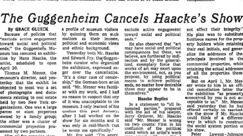 Albert-László Barabási and Louis Shekhtman’s article on the funding sources of American art may not deliver major revelations, but it begins to probe institutional funding structures in novel ways. Neither institutional critique (cf. Hans Haacke; fig. 1) nor probing analyses of art-world finances are new,1 nor are analyses of board overlaps.2 Even so, the attempt to use computational science—namely, network analysis—to understand how museums are supported is a worthy development.