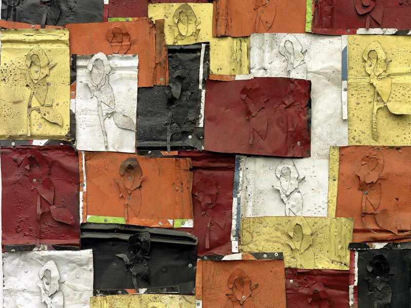As such, it is probable that the average visitor to the RA would be unaware of many, if not all, of the artists shown in the exhibition. Thornton Dial, the Alabama-born metal-furniture maker and radical sculptor of the found object, is the best known of the group. He is presented as being central to the social world of these artists, as the father to artists Thornton Jr. and Richard, as well as uncle to Ronald Lockett, all of whom are included in the show. Lockett’s elegy for his great-grandmother, Sarah Lockett’s Roses (fig. 1), is one of the highlights of the exhibition: a profound and rough-edged work that fuses, like a collage or a familial quilt, cut tins, nails, and enamel on wood. Its cut-glass roses stand for love, for remembrance, and for something beautiful being kept in the voluminosity of its blooms, rather than withering away. I found its hardness and lack of delicacy to be compelling as a eulogy. Other works by this familial group are assemblages indicating life and genealogy. An example is Thornton Dial’s Tree of Life (In the Image of Old Things) (1994), which throws everything from a plastic air freshener to a rubber tire into the twisting and interconnected warren of a family tree, where nothing seems to fit together. The result looks so precariously balanced as to be at the threshold of collapse at any moment, yet the tree of life manages to stay up.