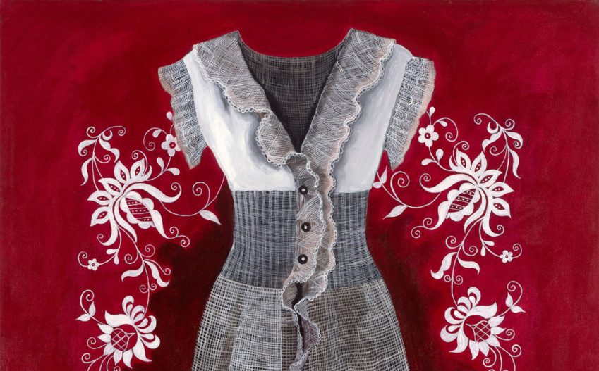 At the main entrance to the exhibition, visitors encounter several vertical pieces by Brazilian-born artist Kenzi Shiokava. These untitled works, made of wood and dated 2017, share space with two strikingly different works by Eduardo Tokeshi, an artist who lives in Peru. Bandera Uno (1985), a flaglike painting created with latex on canvas, contrasts with the artist’s Casitas de Fe (2016), composed of mixed-media boxes with representations of religious themes. Both works employ images—a governmental banner in one case and invocations of faith in the other—that speak in subtle ways of national and personal identity.