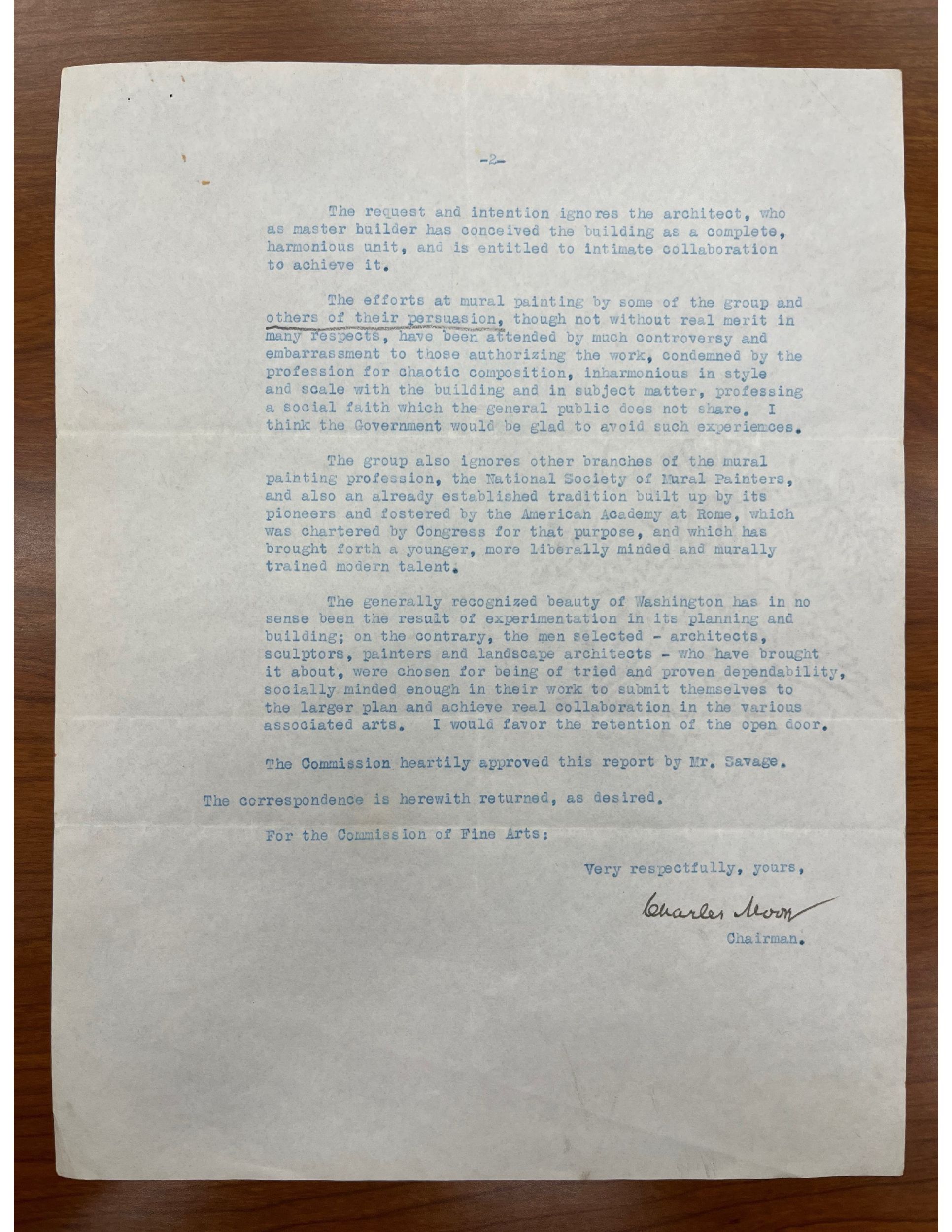 A review of Biddle’s papers at the Library of Congress provides several corrections to the version he presents in his memoirs. The finding aid to the Biddle papers lists box 30 as the location of communications from Roosevelt in 1933–43. There is only one item in box 30, file 5: “General Corr-FDR,” a letter dated July 31, 1933, and postmarked at Poughkeepsie on August 1, 1933 (see fig. 1a–c). Roosevelt’s very short cover letter consists only of the two sentences quoted by Biddle: “The enclosed from the Fine Arts Commission speaks for itself. It does not sound very encouraging for the mural painting.” The enclosure is a two-page letter from Charles Moore, chairman of the Commission on Fine Arts, dated July 26, 1933. Most of that letter quotes a member of the commission, Eugene F. Savage. Savage’s analysis contains some of the phrases quoted by Biddle in his memoirs but not always in the same context. The phrase “several assumptions and conclusions in the statement that might prove fatal to the project” is clearly a reference to Biddle’s proposal for the Justice Department. Savage raises questions about the suitability of fresco as a medium for buildings requiring artificial heat. Savage also states: “The efforts at mural painting by some of the group and others of their persuasion [Biddle underlined the last four words in pencil], though not without real merit in many respects, have been attended by much controversy and embarrassment to those authorizing the work, condemned by the profession for chaotic composition, inharmonious in style and scale with the building and in subject matter, professing a social faith which the general public does not share.” Savage’s reference to the American Academy in Rome is mostly the same as Biddle reported. As is plain to see, neither Roosevelt’s cover letter nor the detailed analysis provided by the commission contains any reference to Rivera, Lenin’s head, or communists, although “a social faith which the general public does not share” was almost certainly a reference to the Left.