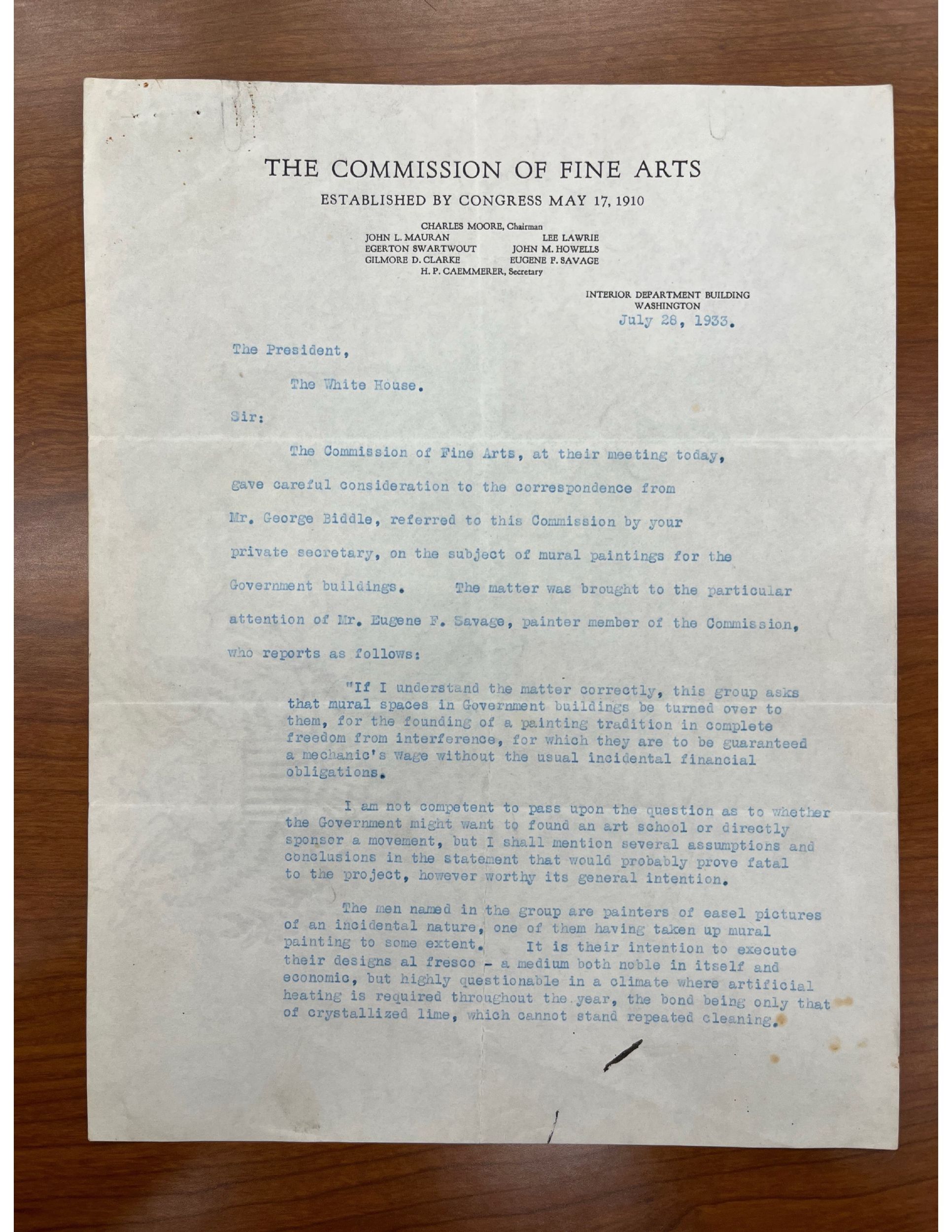 In his autobiography, Biddle then recounts that, in mid-1933, several weeks after that first letter, he sent Roosevelt another letter, proposing a specific mural project, including certain artists, for the Justice Department building. Roosevelt sent this second proposal from Biddle to the federal Fine Arts Commission for review and comment. That agency returned a negative review. According to Biddle’s memoirs, on August 6, 1933, Roosevelt sent the commission’s review to Biddle with a short cover memo that said only: “The enclosed from the Fine Arts Commission speaks for itself. It does not sound very encouraging for the mural painting” (fig. 1a).5