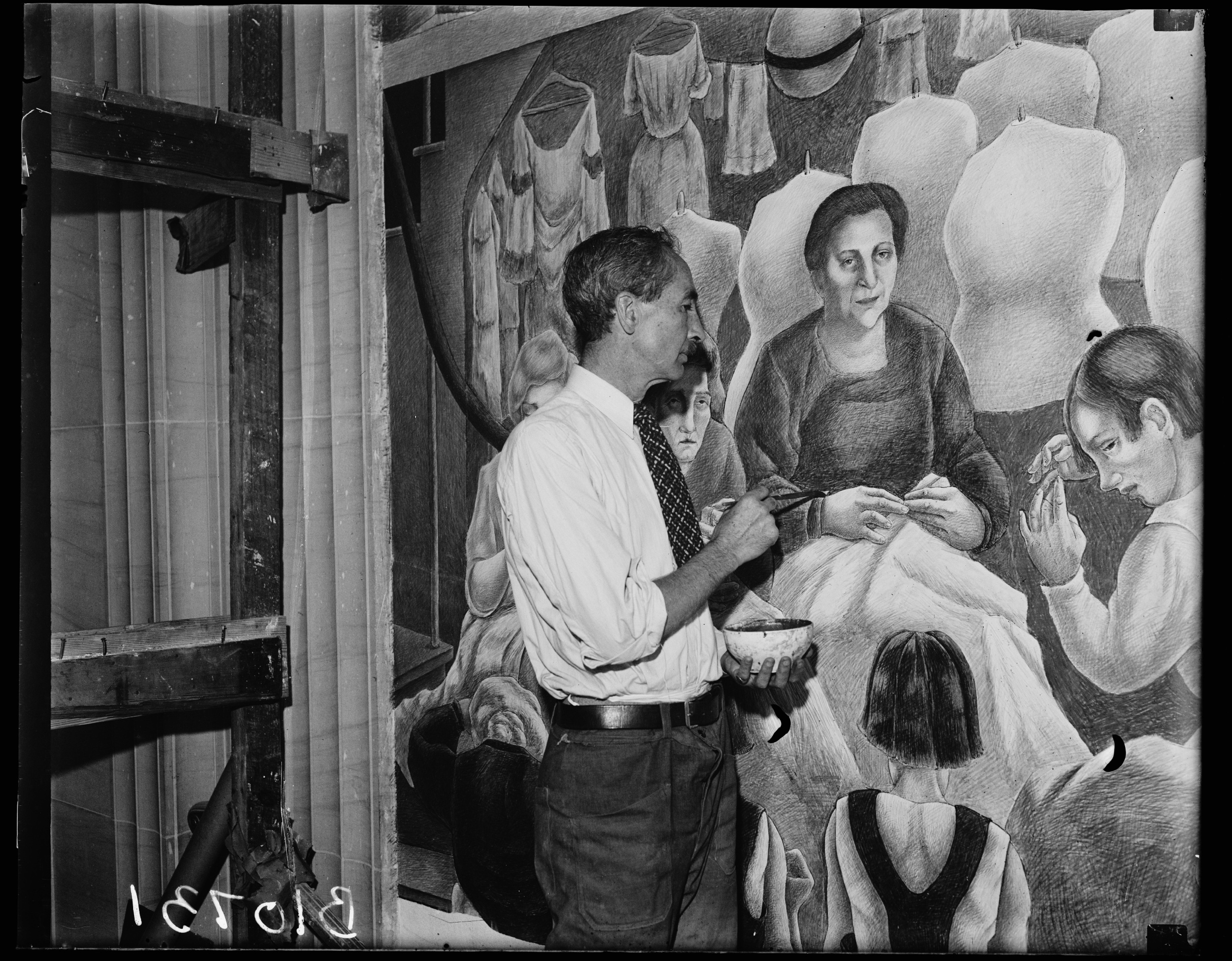 - Biddle, An American Artist’s Story, 273–83. The available photos of Biddle with his mural at the Department of Justice building seem to be posed for two reasons. First, fresco artists work from the top down (as seen, e.g., in Cherny, The Coit Tower Murals, 15–16, figs. 2.1–.2), and Biddle’s photos show him with paintbrush in hand, posed above the completed mural. Second, mural artists typically do not work in a white shirt and tie while applying pigment to wet plaster. ↵